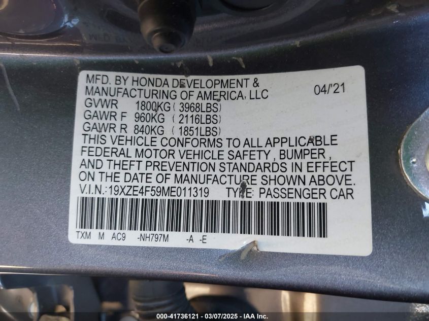 2021 HONDA INSIGHT 2021 Hybrid, 1.5, Front wheel drive, VIN - 19XZE4F59ME****** from the USA
