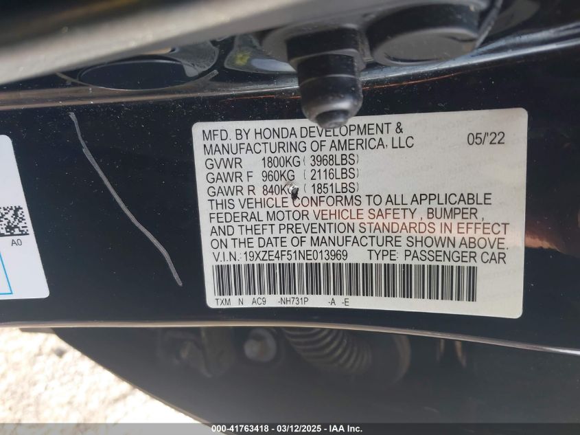Color BlackCylinders 4Drive Front wheel driveVIN 19XZE4F51NE******State Run & Drive VerifiedDamage Right side AutoRIA