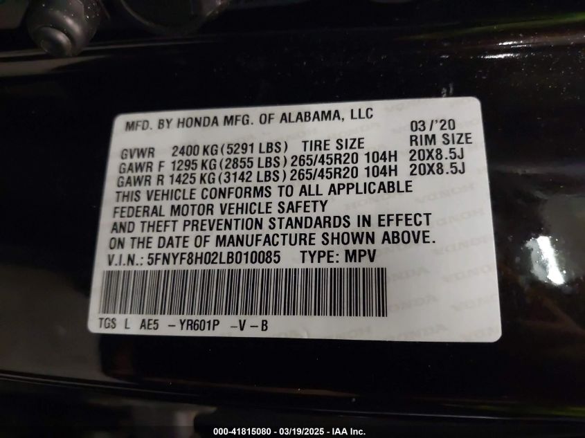 Color BrownCylinders 6Drive Full driveVIN 5FNYF8H02LB******State Run & Drive VerifiedDamage Front left AutoRIA