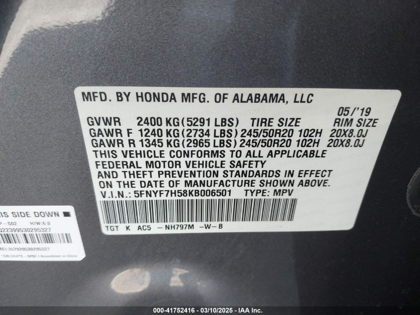 Color GrayCylinders 6Drive Front wheel driveVIN 5FNYF7H58KB******State Run & Drive VerifiedDamage Front or backAuction date 2025-03-27 AutoRIA