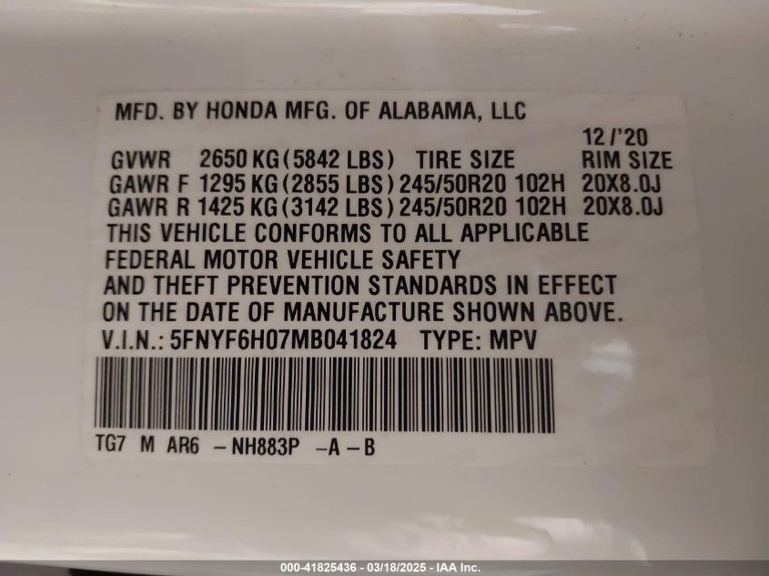 2021 HONDA PILOT 2021 Gasoline, 3.5, Full drive, VIN - 5FNYF6H07MB****** from the USA