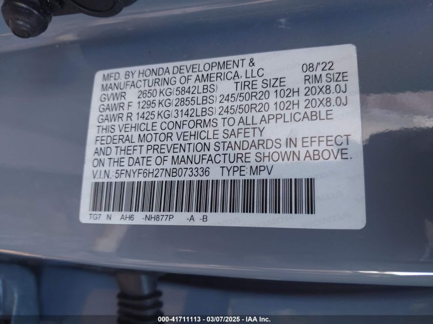 2022 HONDA PILOT 2022 Gasoline, 3.5, Full drive, VIN - 5FNYF6H27NB****** from the USA