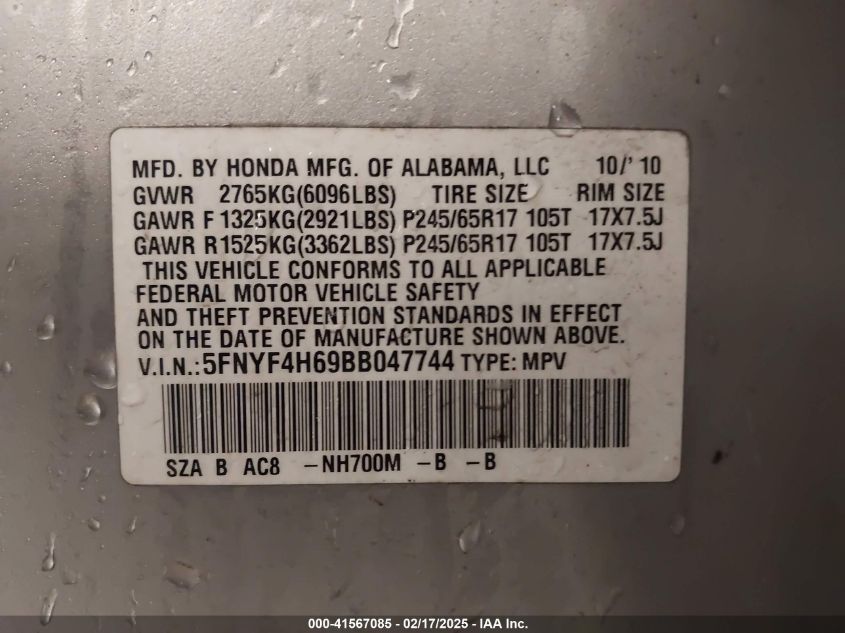 Color SilverCylinders 6Drive Full driveVIN 5FNYF4H69BB******State Run & Drive VerifiedDamage Front right AutoRIA
