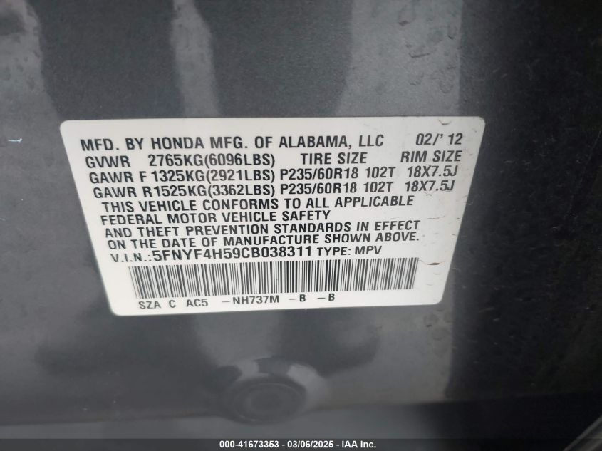 Color GrayCylinders 6Drive Full driveVIN 5FNYF4H59CB******State Run & Drive VerifiedDamage Front or backAuction date 2025-03-20 AutoRIA