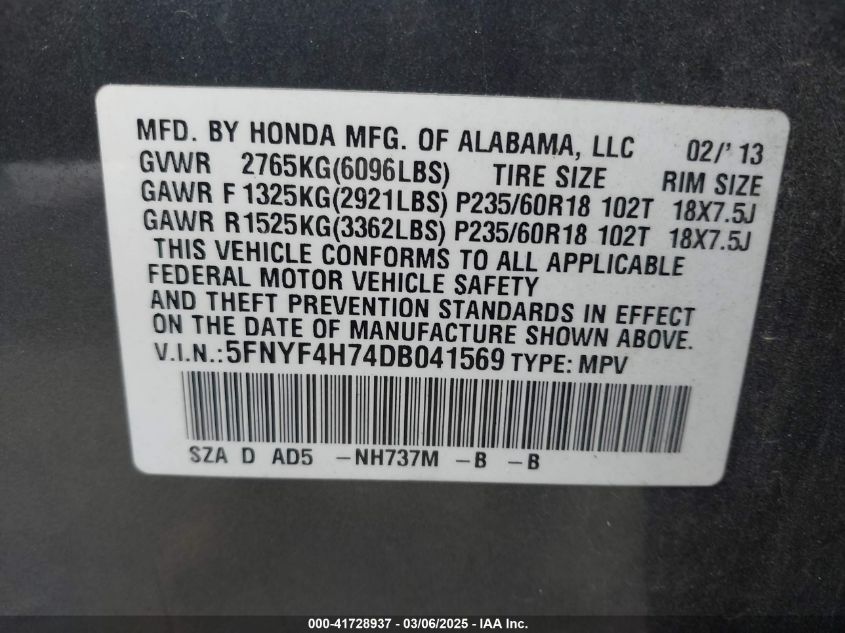 Color GrayCylinders 6Drive Full driveVIN 5FNYF4H74DB******State Run & Drive VerifiedDamage Front or back AutoRIA