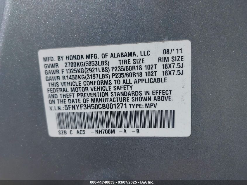 Color SilverCylinders 6Drive Front wheel driveVIN 5FNYF3H50CB******State Run & Drive VerifiedDamage Front right AutoRIA