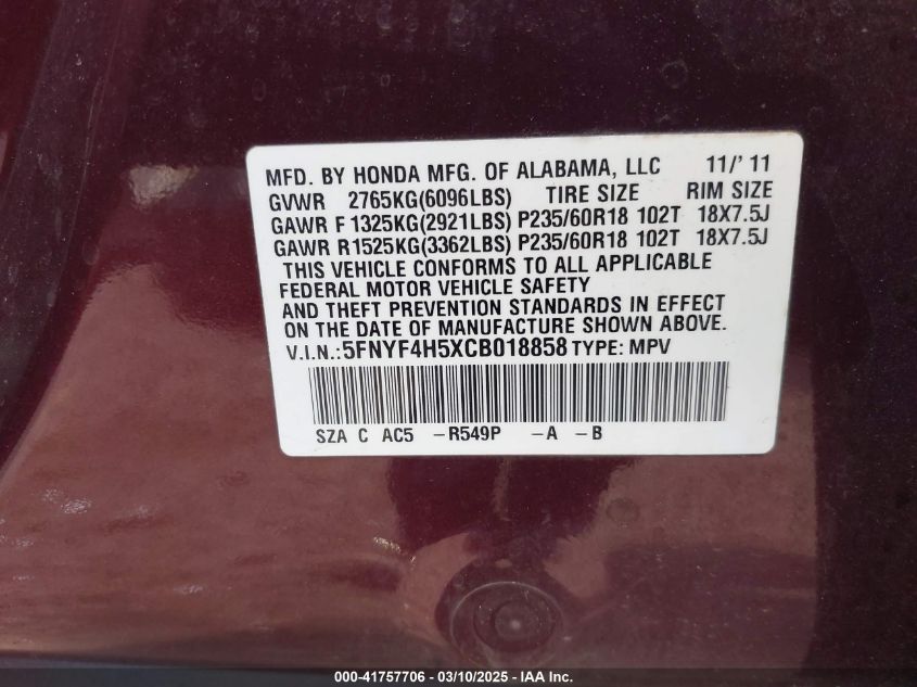 Color BurgundyCylinders 6Drive Full driveVIN 5FNYF4H5XCB******State Run & Drive VerifiedDamage Back AutoRIA