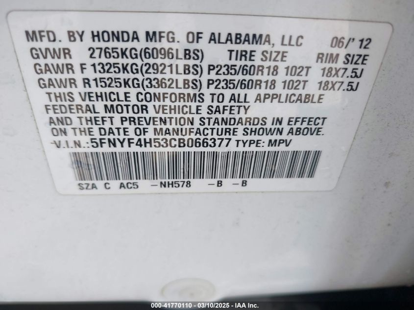 Color WhiteCylinders 6Drive Full driveVIN 5FNYF4H53CB******State Run & Drive VerifiedDamage Front or back AutoRIA