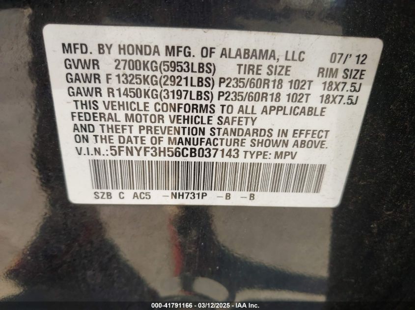 Color BlackCylinders 6Drive Front wheel driveVIN 5FNYF3H56CB******State Run & Drive VerifiedDamage InsignificantAuction date 2025-03-26 AutoRIA