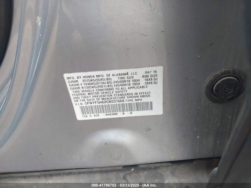 Color SilverCylinders 6Drive Front wheel driveVIN 5FNYF5H62GB******State Run & Drive VerifiedDamage Right side AutoRIA