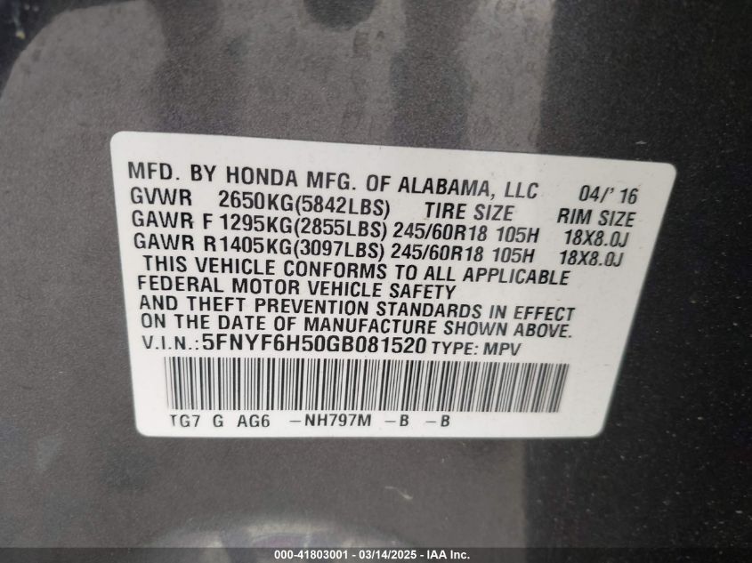 Color GrayCylinders 6Drive Full driveVIN 5FNYF6H50GB******State Run & Drive VerifiedDamage Front or back AutoRIA