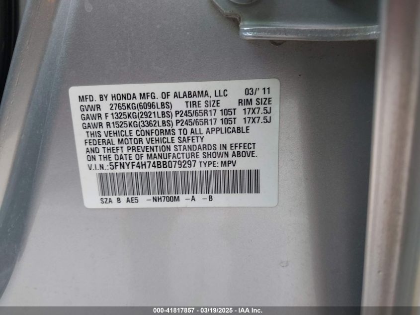 Color SilverCylinders 6Drive Full driveVIN 5FNYF4H74BB******State Run & Drive VerifiedDamage Front or back AutoRIA