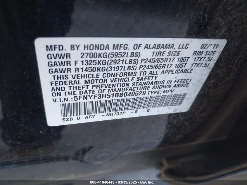 Color BlackCylinders 6Drive Front wheel driveVIN 5FNYF3H51BB******State Run & Drive VerifiedDamage Insignificant AutoRIA