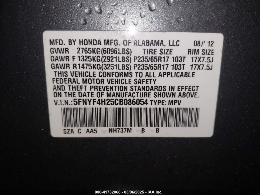 Color GrayCylinders 6Drive Full driveVIN 5FNYF4H25CB******State Run & Drive VerifiedDamage Front or back AutoRIA