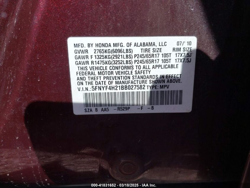 Color BurgundyCylinders 6Drive Full driveVIN 5FNYF4H21BB******State Run & Drive VerifiedDamage Left side AutoRIA