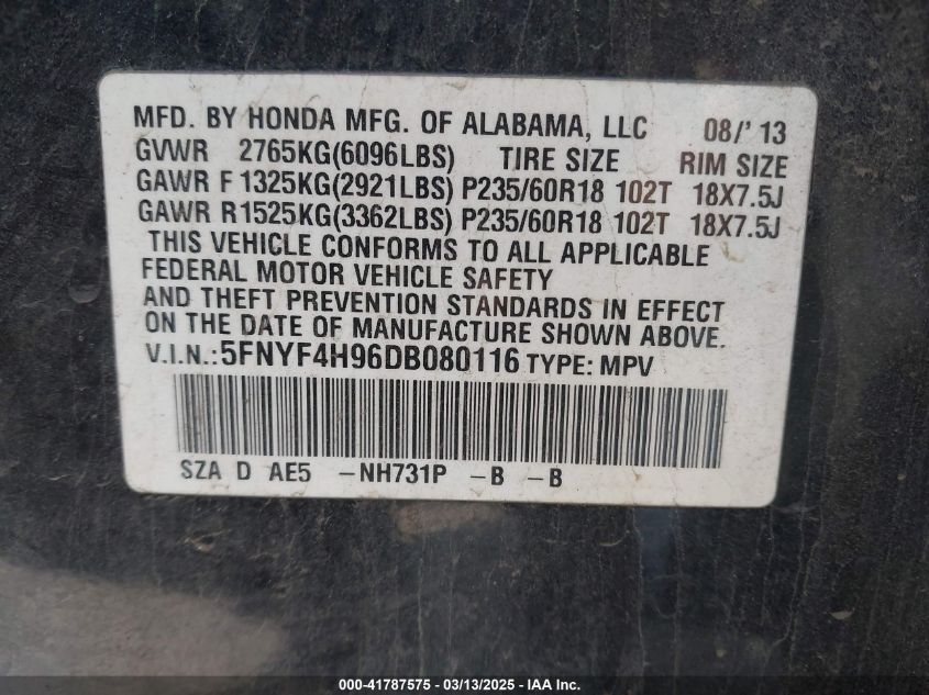 Color BlackCylinders 6Drive Full driveVIN 5FNYF4H96DB******State Run & Drive VerifiedDamage Left side AutoRIA
