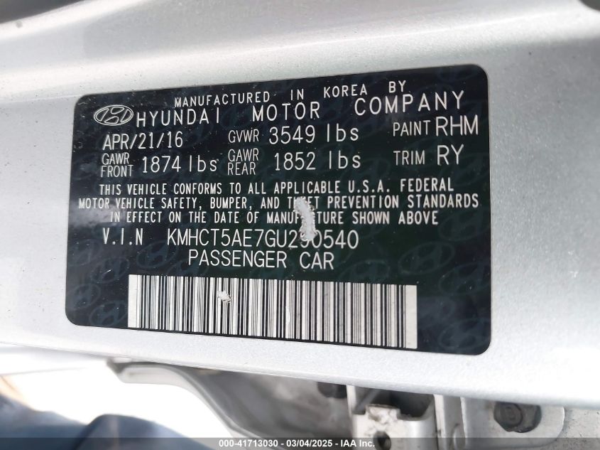 Color SilverCylinders 4Drive Front wheel driveVIN KMHCT5AE7GU******State Run & Drive VerifiedDamage Front leftAuction date 2025-03-20 AutoRIA