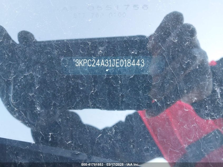 Color GrayCylinders 4Drive Front wheel driveVIN 3KPC24A31JE******State Run & Drive VerifiedDamage Back AutoRIA