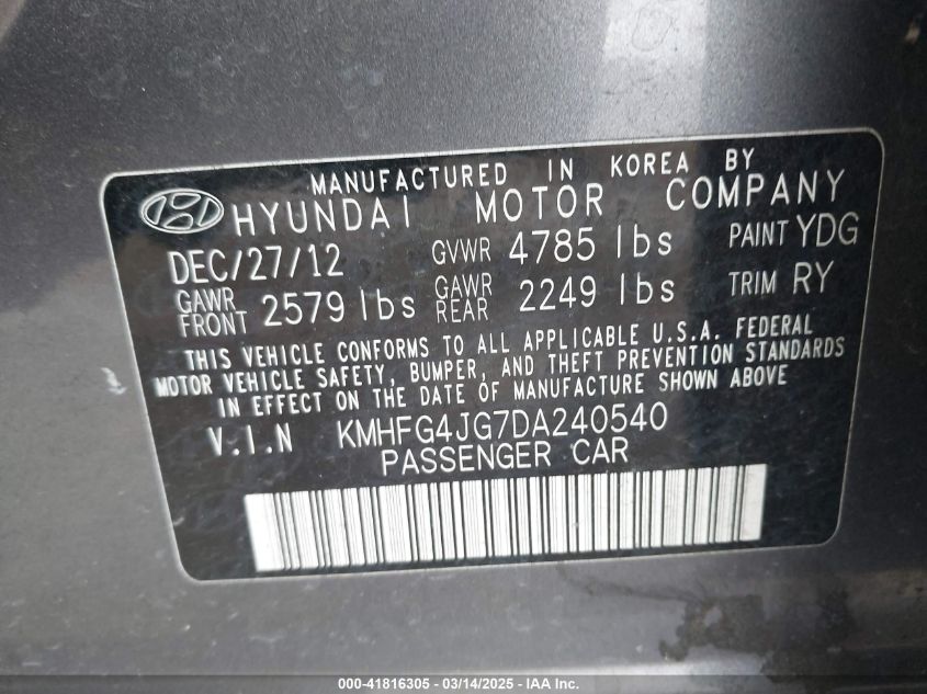 Color GrayCylinders 6Drive Front wheel driveVIN KMHFG4JG7DA******State Run & Drive VerifiedDamage Front or backAuction date 2025-03-26 AutoRIA