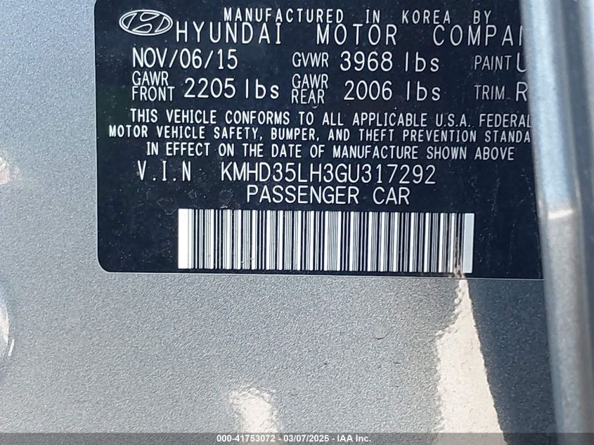 Color GrayCylinders 4Drive Front wheel driveVIN KMHD35LH3GU******State Run & Drive VerifiedDamage Front or backAuction date 2025-03-27 AutoRIA