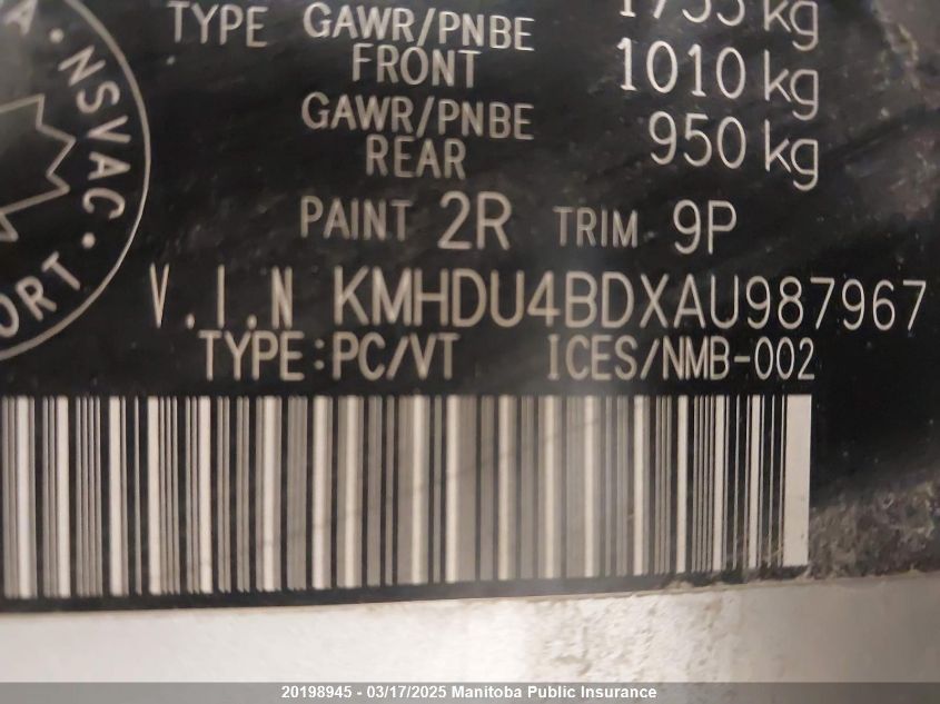 Color SilverCylinders 4Drive UnknownVIN KMHDU4BDXAU******State Run & Drive VerifiedDamage Front rightAuction date 2025-03-26 AutoRIA