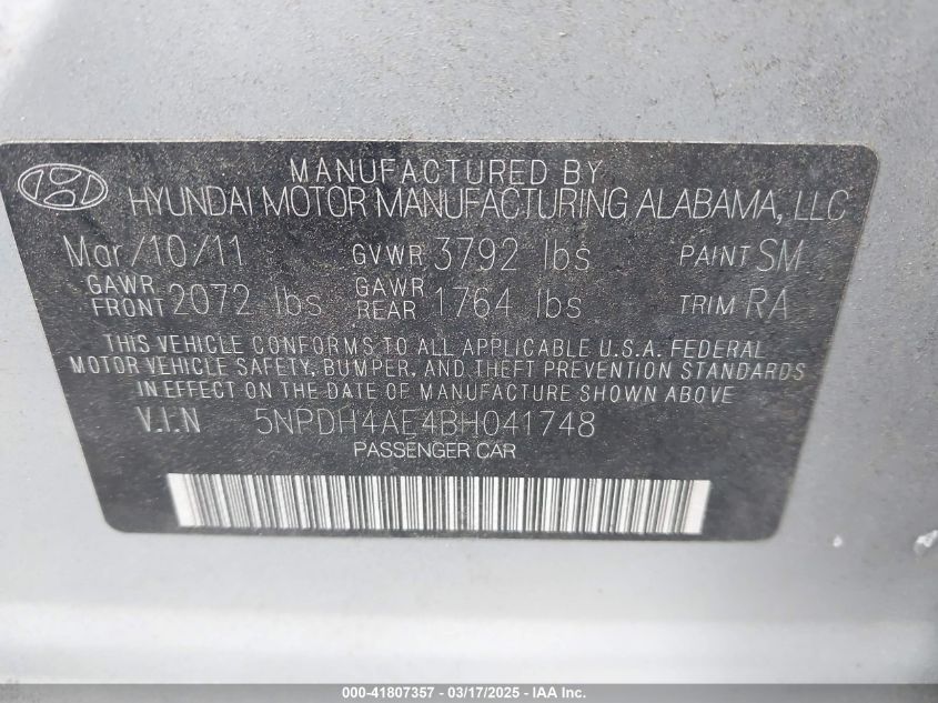 Color SilverCylinders 4Drive Front wheel driveVIN 5NPDH4AE4BH******State Run & Drive VerifiedDamage Vandalism AutoRIA