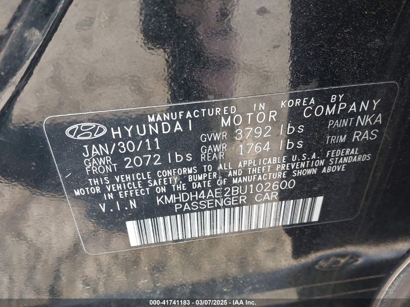 Color BlackCylinders 4Drive Front wheel driveVIN KMHDH4AE2BU******State Run & Drive VerifiedDamage Right sideAuction date 2025-03-20 AutoRIA