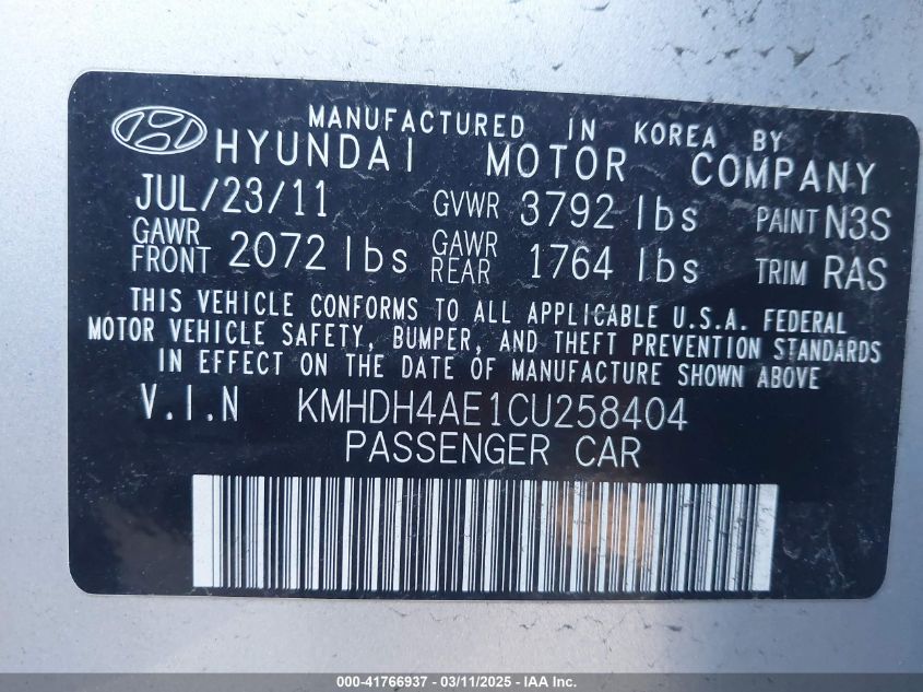 Color SilverCylinders 4Drive Front wheel driveVIN KMHDH4AE1CU******State Run & Drive VerifiedDamage Rear leftAuction date 2025-03-25 AutoRIA
