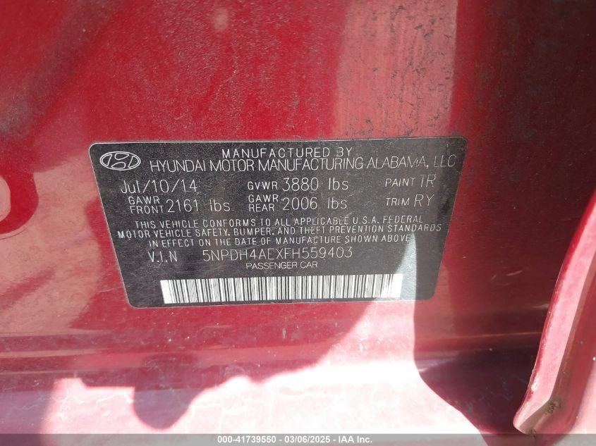 2015 HYUNDAI ELANTRA 2015 Gasoline, 1.8, Front wheel drive, VIN - 5NPDH4AEXFH****** from the USA