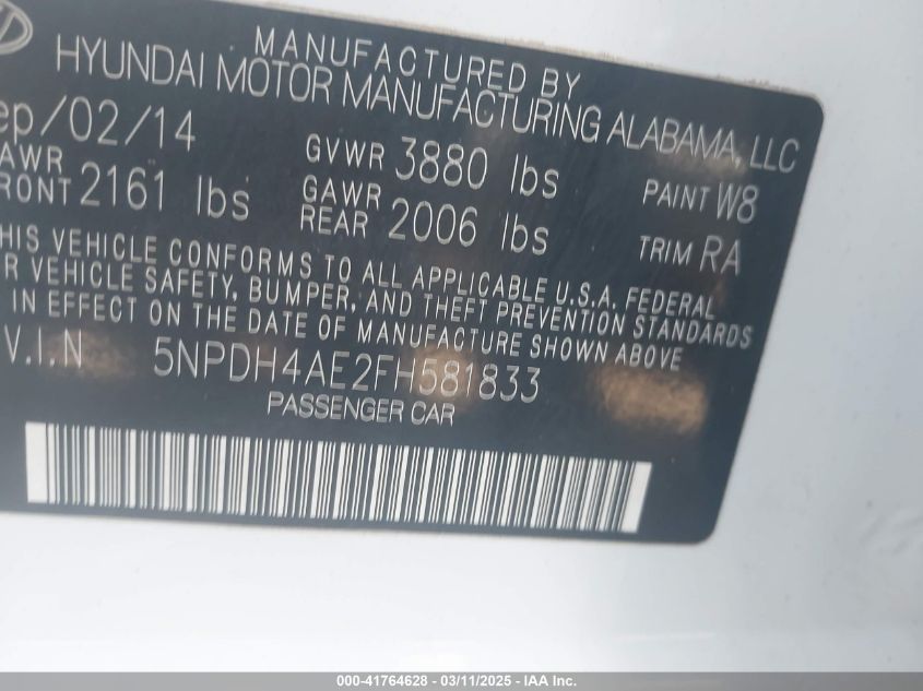2015 HYUNDAI ELANTRA 2015 Gasoline, 1.8, Front wheel drive, VIN - 5NPDH4AE2FH****** from the USA