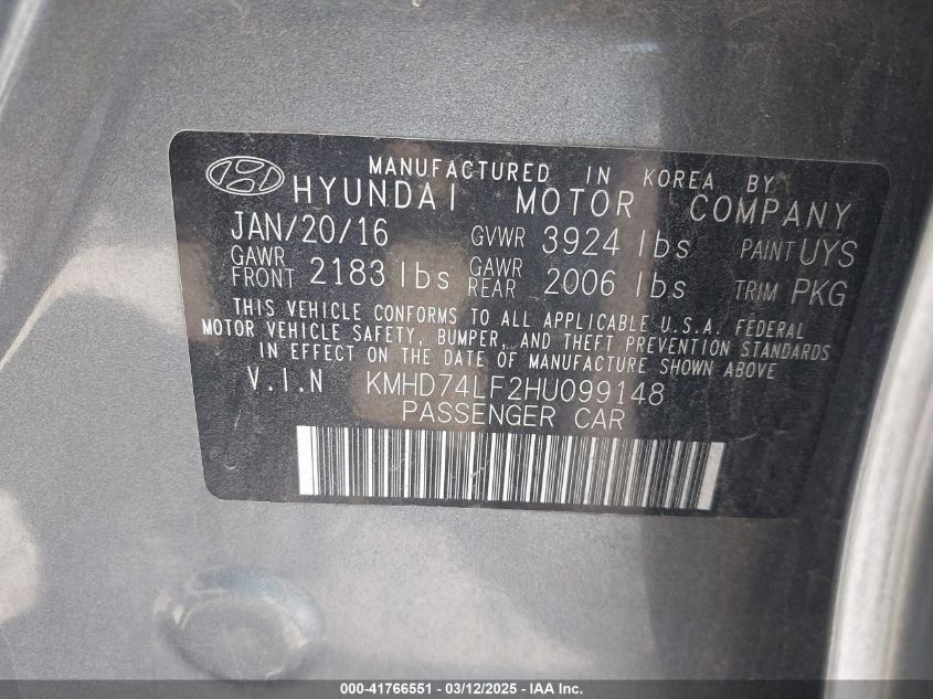 2017 HYUNDAI ELANTRA 2017 Gasoline, 2.0, Front wheel drive, VIN - KMHD74LF2HU****** from the USA