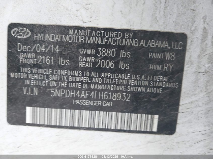 2015 HYUNDAI ELANTRA 2015 Gasoline, 1.8, Front wheel drive, VIN - 5NPDH4AE4FH****** from the USA