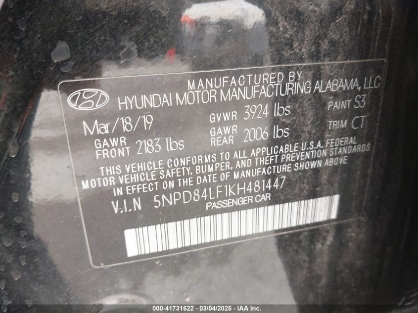 2019 HYUNDAI ELANTRA 2019 Gasoline, 2.0, Front wheel drive, VIN - 5NPD84LF1KH****** from the USA