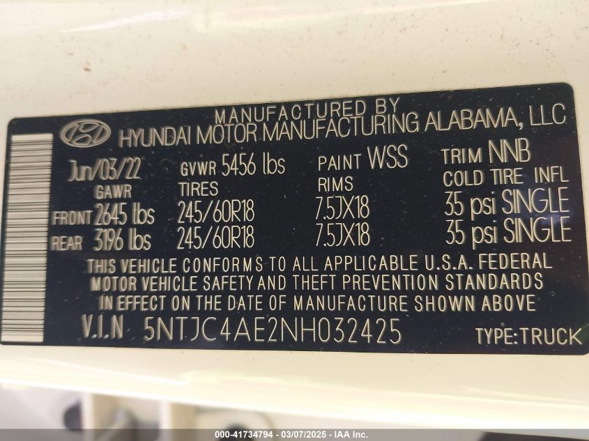 Color WhiteCylinders 4Drive Front wheel driveVIN 5NTJC4AE2NH******State Run & Drive VerifiedDamage Front rightAuction date 2025-03-24 AutoRIA