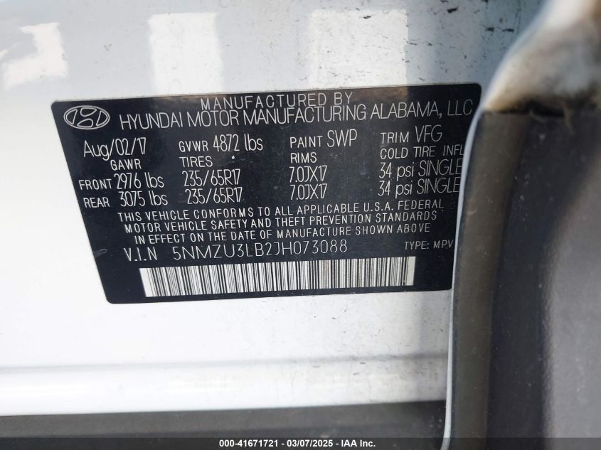 Color WhiteCylinders 4Drive Front wheel driveVIN 5NMZU3LB2JH******State Run & Drive VerifiedDamage Front or backAuction date 2025-03-26 AutoRIA