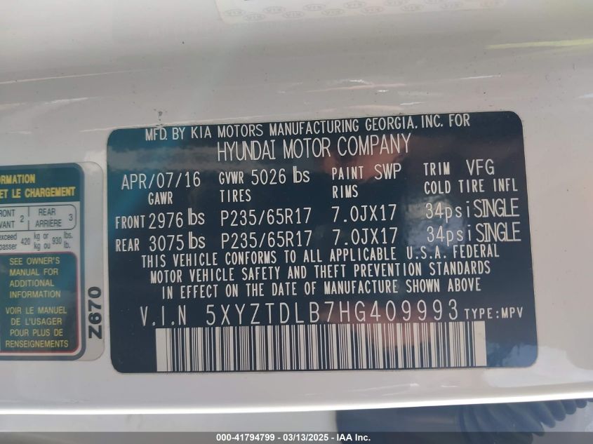 2017 HYUNDAI SANTA FE 2017 Gasoline, 2.4, Full drive, VIN - 5XYZTDLB7HG****** from the USA