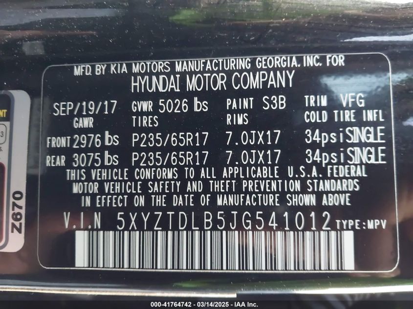 2018 HYUNDAI SANTA FE 2018 Gasoline, 2.4, Full drive, VIN - 5XYZTDLB5JG****** from the USA