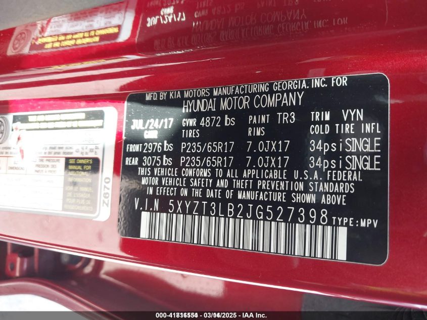 Color RedCylinders 4Drive Front wheel driveVIN 5XYZT3LB2JG******State Run & Drive VerifiedDamage Insignificant AutoRIA