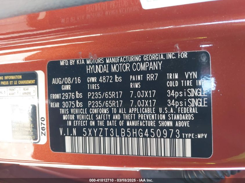 2017 HYUNDAI SANTA FE 2017 Gasoline, 2.4, Front wheel drive, VIN - 5XYZT3LB5HG****** from the USA