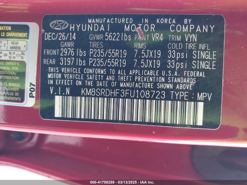 Color RedCylinders 6Drive Full driveVIN KM8SRDHF3FU******State Run & Drive VerifiedDamage Front or backAuction date 2025-03-20 AutoRIA