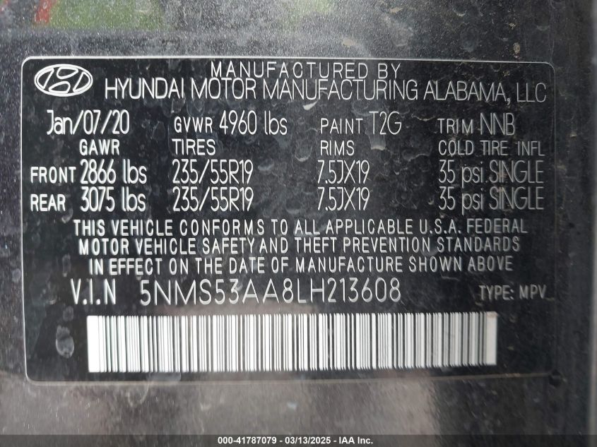 2020 HYUNDAI SANTA FE 2020 Gasoline, 2.0, Front wheel drive, VIN - 5NMS53AA8LH****** from the USA