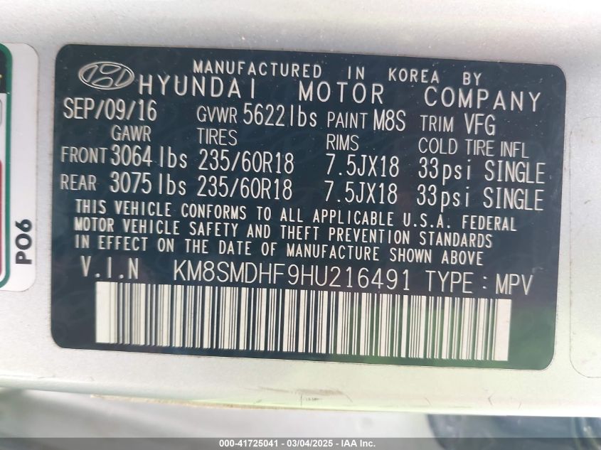 2017 HYUNDAI SANTA FE 2017 Gasoline, 3.3, Full drive, VIN - KM8SMDHF9HU****** from the USA