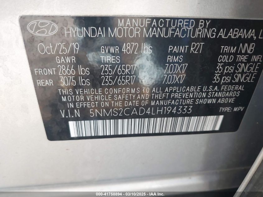 2020 HYUNDAI SANTA FE 2020 Gasoline, 2.4, Full drive, VIN - 5NMS2CAD4LH****** from the USA