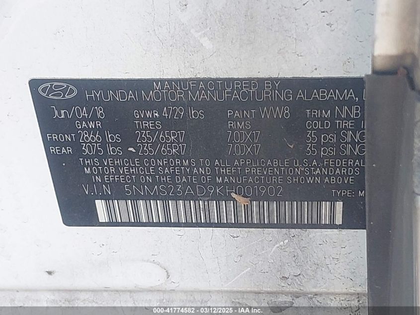 2019 HYUNDAI SANTA FE 2019 Gasoline, 2.4, Front wheel drive, VIN - 5NMS23AD9KH****** from the USA