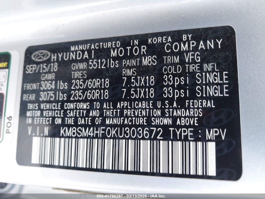 2019 HYUNDAI SANTA FE 2019 Gasoline, 3.3, Front wheel drive, VIN - KM8SM4HF0KU****** from the USA