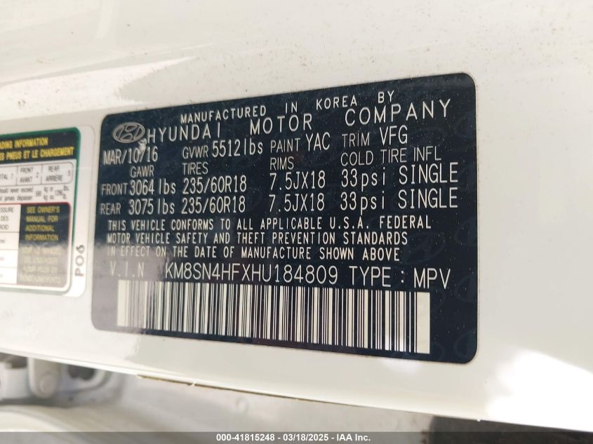 2017 HYUNDAI SANTA FE 2017 Gasoline, 3.3, Front wheel drive, VIN - KM8SN4HFXHU****** from the USA