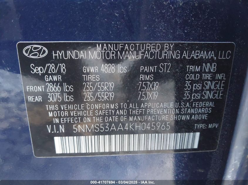 2019 HYUNDAI SANTA FE 2019 Gasoline, 2.0, Front wheel drive, VIN - 5NMS53AA4KH****** from the USA