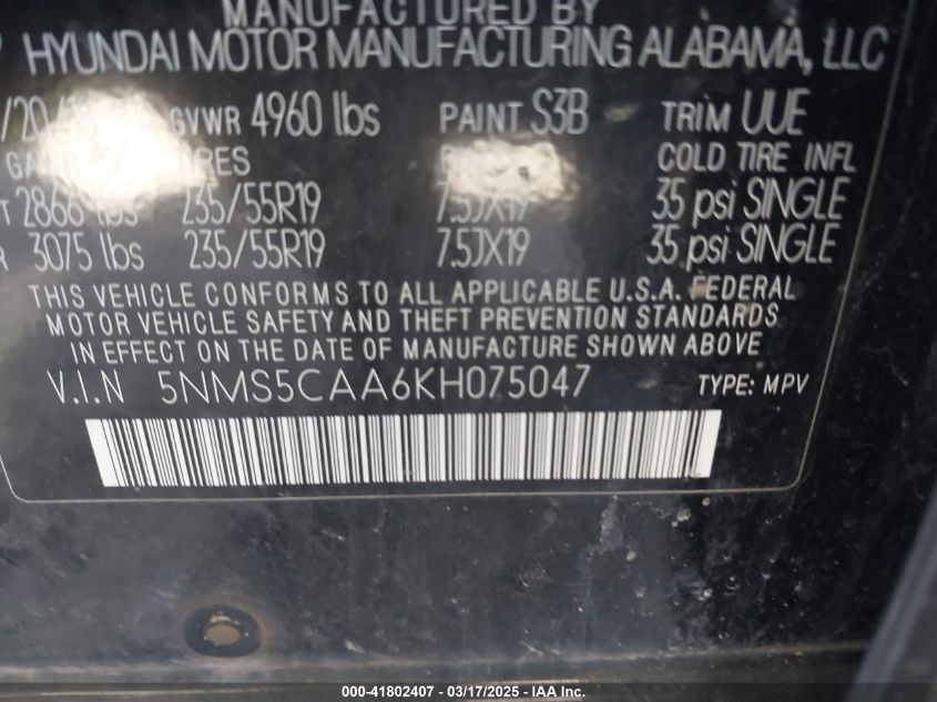 2019 HYUNDAI SANTA FE 2019 Gasoline, 2.0, Full drive, VIN - 5NMS5CAA6KH****** from the USA