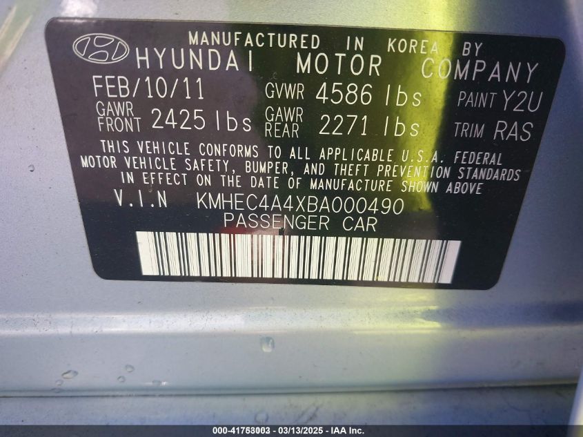 Color BlueCylinders 4Drive Front wheel driveVIN KMHEC4A4XBA******State Run & Drive VerifiedDamage Front or back AutoRIA