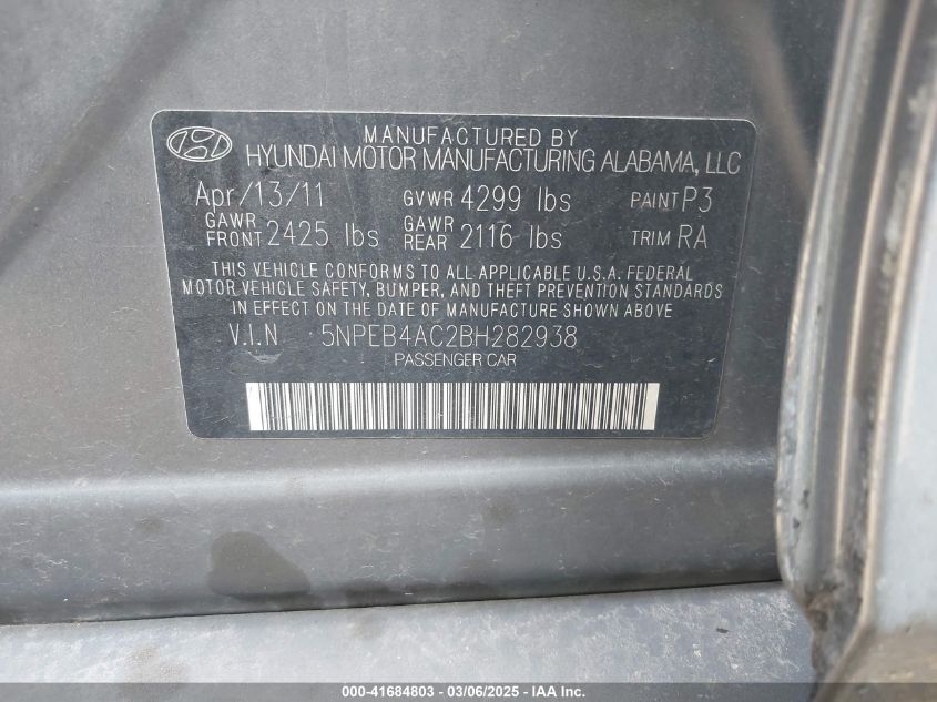 Color GrayCylinders 4Drive Front wheel driveVIN 5NPEB4AC2BH******State Run & Drive VerifiedDamage Front or back AutoRIA